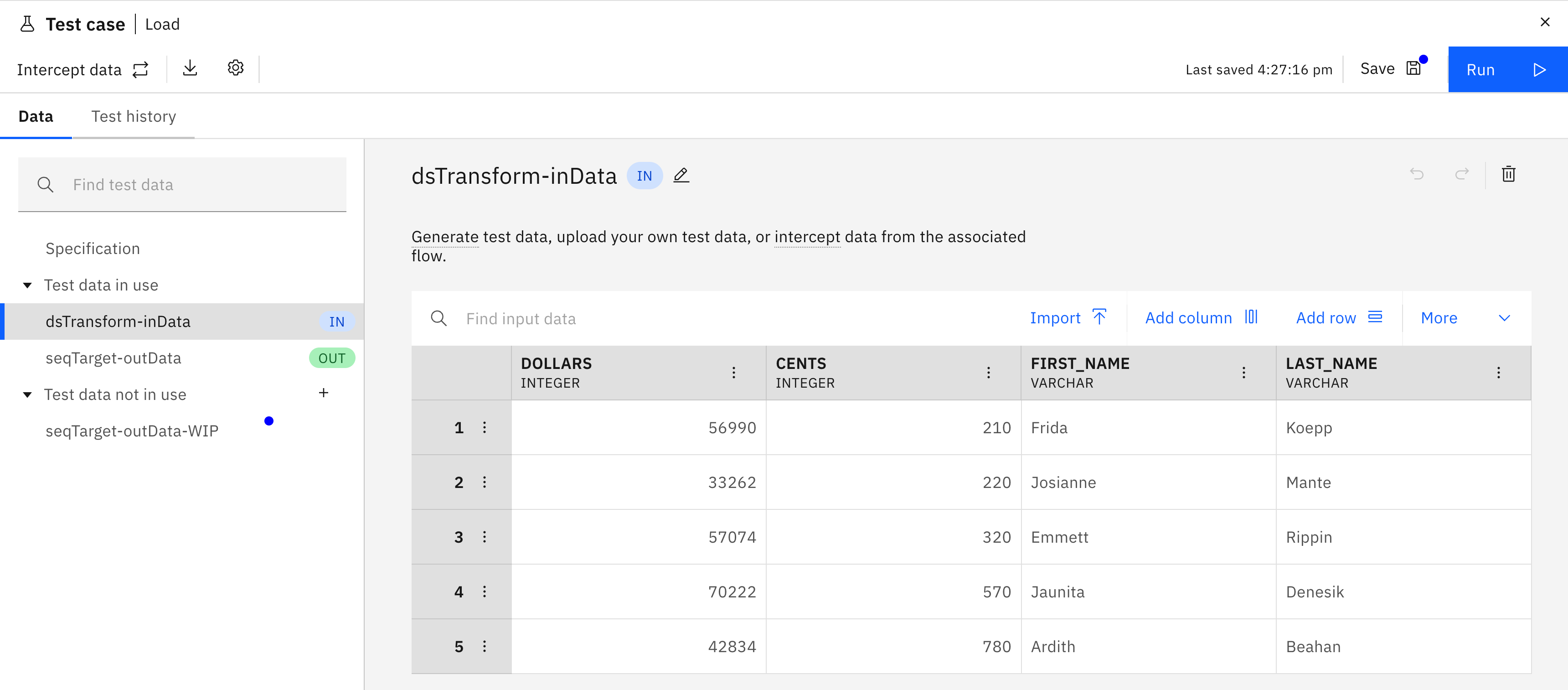 - From the DataStage canvas open an existing DataStage flow then click the Test cases icon to open up the test cases side panel from where you can click the name of the test case you wish to edit.