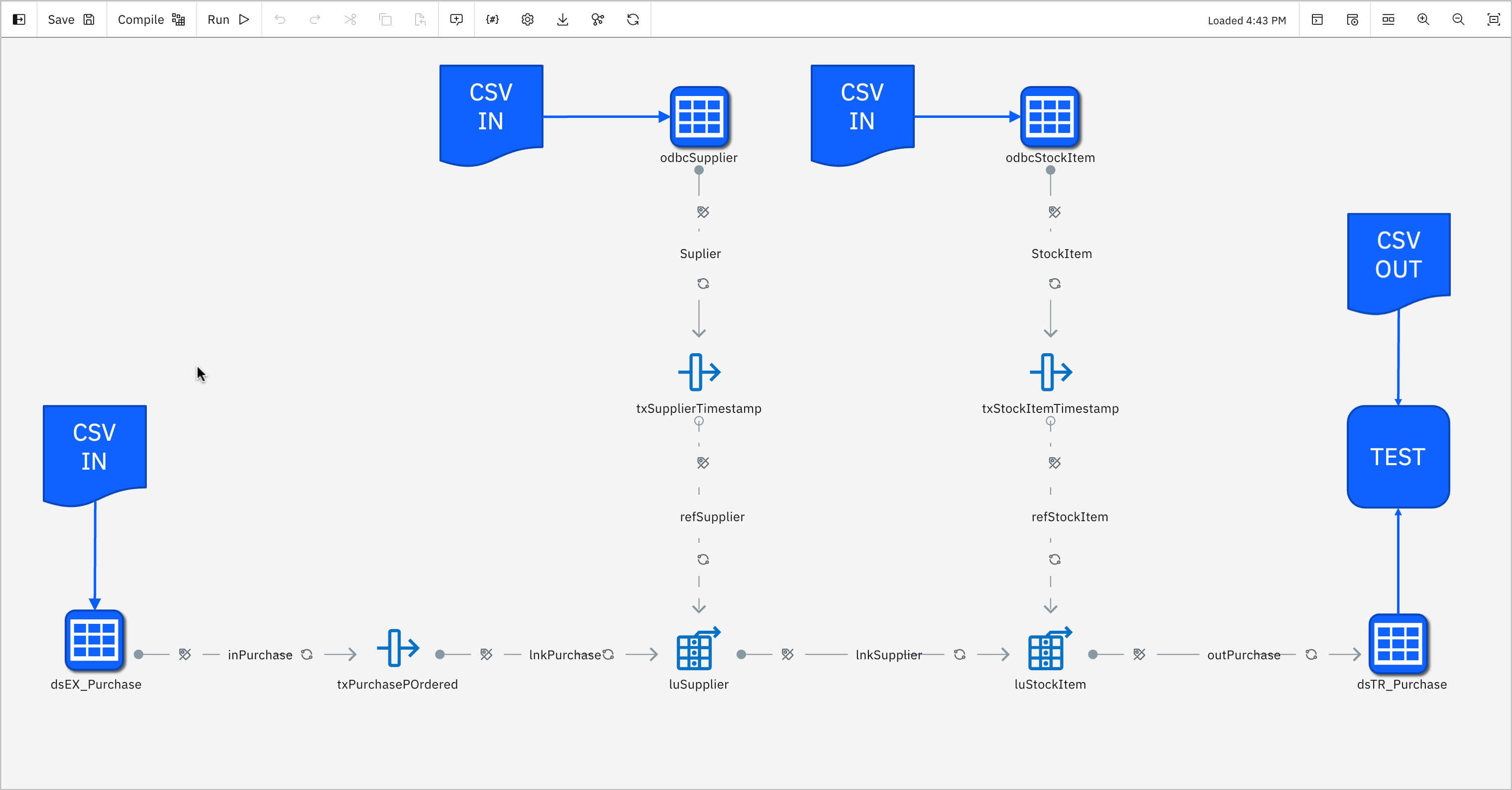 Similarly, your flow's output stage(s) will be replaced at runtime with components which read the incoming data and compare it to the relevant CSV data files containing the output expected on those links. Any differences are reported in the test results.